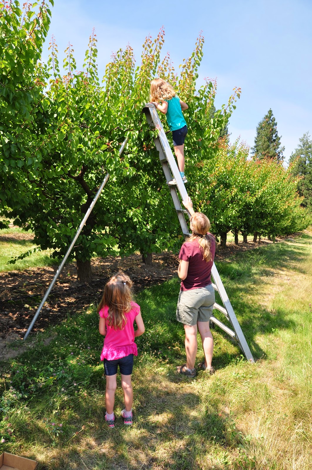 Meanwhile in blog land, I came across some great photos from I think was our first visit to Green Bluff. What is Green Bluff you ask?? It's about a 40 minute drive from our house to a host of orchards and farms where you can go and pick your own fruit. We had heard about it since the day we arrived but this was our first chance to go try it for ourselves. At the time, apricots were in season. While I don't remember even trying an apricot, I definitely had my reservations. Oh MAN were they good!!!! We all had a BLAST picking the fresh fruit off the trees.